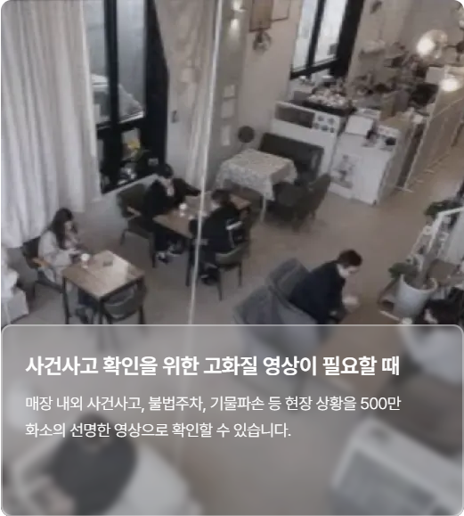 매장 또는 사업장에서 사건이나 사고 발생시, CCTV 영상을 확인할 수 있어 수사에 중요한 증거가 됩니다. 또한 녹화된 영상이 일정 기간 보관되어 사건 발생 후에도 효과적으로 대처할 수 있습니다.